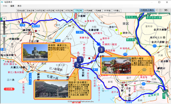 収録する観光・宿泊・食事施設の情報をもとに作成した旅行行程表のコースを地図上に表示しました。