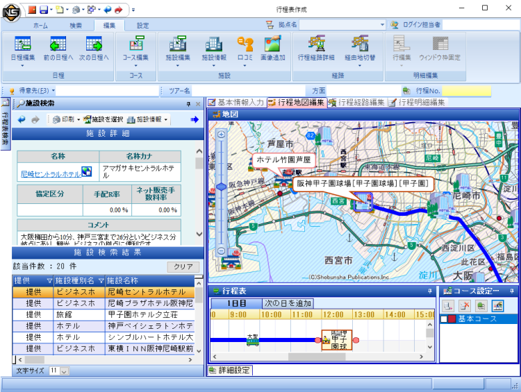 行程表は、経験の浅いスタッフ様でも、位置情報を持たせた観光施設や道路情報を組み合わせ、簡単に明細表示ではイメージしにくい旅行行程を地図上で確認しながら、作成できることが重要です。
