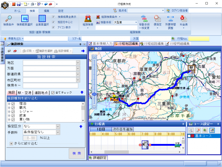 必要な情報を選択するだけで行程表・見積書を素早く作成し、コース経路時間も自動検索。行程表からデータ連動で、見積書・損益検討書の作成も可能なシステムです。