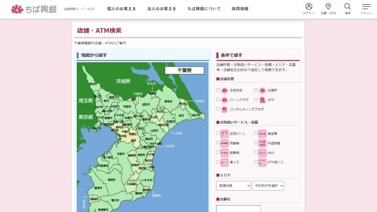千葉県内に多数のお客様を抱える千葉興業銀行様では、公式サイトにおいて、自社の店舗及びATMの案内地図として当社の地図配信オールインワンプロダクト「Mapple 店舗・施設検索システム」をご利用いただいております。
