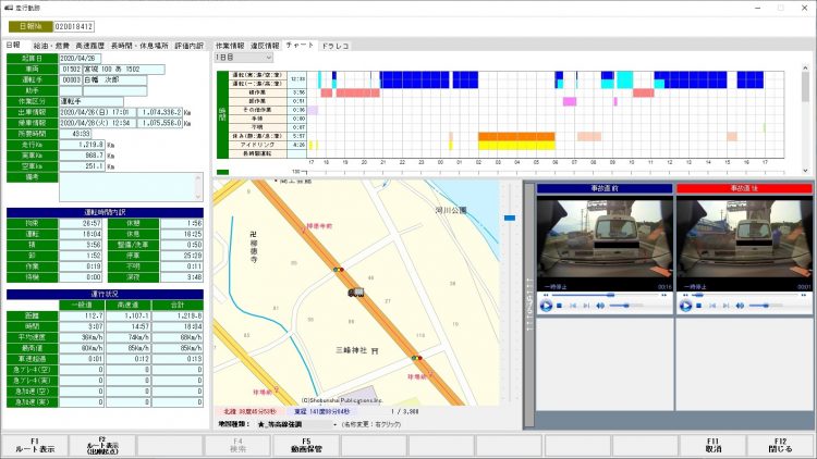 「デシナプスⅡ」はデジタコで走行してきた軌跡を地図上に描画し、適正なルートを走行しているか確認、急ブレーキ・急加速・速度超過に対する乗務員への指導・教育にも活用できる処理です。ドラレコ画像・動画とリンクさせることで画面で運行内容をすべて把握することも可能です。