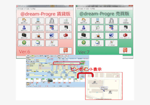 「@dream-Progre」は、不動産会社でインターネットを利用・運営する上でのノウハウが詰まったシステムです。物件情報をデータベース管理し、ワンタッチでHPを更新したりSNS(TwitterやYoutube、Facebookなど)に投稿することも可能です。