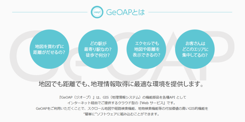 スクロール地図や経路検索機能、地物検索機能等の付加価値の高いGIS的機能をインターネット経由でご提供するクラウド型のWebサービス「GeOAP(ジオープ)」の各種APIで利用するデータとして、デジタル地図データ行政区画ポリゴンデータ歩行者ネットワークデータPOIデータをご利用いただいています。