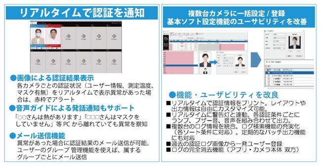 Windows用アプリケーション「facet」(別売)を併用し、カメラをLAN接続すれば、離れた場所、例えばカメラが受付や入り口に設置されていても、警備室やオフィス内で、認証状況や異常発生の有無をリアルタイムに確認することができます。さらに「facet Plus」(別売)では、同時に複数台の監視が可能になります。また、 勤怠管理システムやドアゲートとの連携が可能ですので、カードすら必要としない出退勤打刻、出入場管理が可能となります。