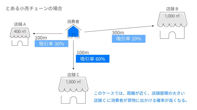 消費者が住む周辺に3つの店舗A、B、Cがあった場合、消費者はどの店舗に買い物に出かける確率が高いかを算出します。ハフモデル分析では、居住地から店舗までの「距離」と、店舗面積といった「店舗の魅力値」の2つが売上に大きく影響することを前提とした考え方のため、店舗までの距離と時間が短ければ短いほど、そして店舗の規模が大きければ大きいほど、消費者が訪問する確率は高くなります。そのため、上記のケースでは消費者は「店舗C」に訪問する確率が高く、この計算を元に売上予測を行います。