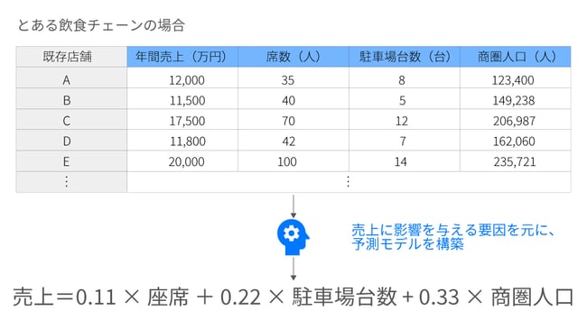 また重回帰分析は、1つの目的変数を複数の説明変数で表した手法のことをいいます。つまり、予測したい売上(目的変数)を席数や駐車場台数などといった複数の項目(説明変数)を数式で表したものです。こちらも言葉だけではわかりづらいかと思いますので、今度は飲食チェーンを例に見ていきましょう。売上に影響を与える項目は様々ありますが、ここでは便宜上、席数、駐車場台数、商圏人口の3つを取り上げてお話をします。下図は飲食チェーンの既存店舗の売上と前述3項目を一覧にまとめたものです(数字は例です)。これらの情報を元に1つの計算式(これを予測モデルといいます)を導き出し、その式に出店候補物件の情報を当てはめることで売上を予測していく手法のことを重回帰分析といいます。