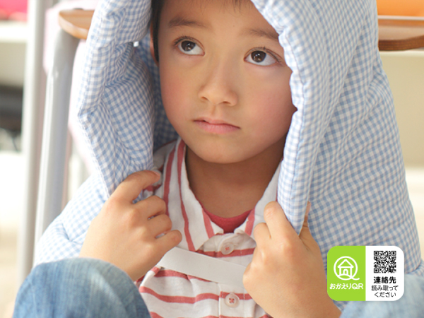 おかえりQRは、迷子の発見だけでなく、災害が起きてお子様と離れてしまった時の安否確認にもご利用いただけます。別々の避難所に駆け込んだ場合にお子様が連絡手段を持っていなくても、避難所の係員などがおかえりQRを読み取っていただくことで連絡をとることができます。また、安否連絡時に撮影した画像を送信できる機能も備えております。ランドセル・帽子など、お子様が普段身につける持ち物に貼り付けてご利用ください。