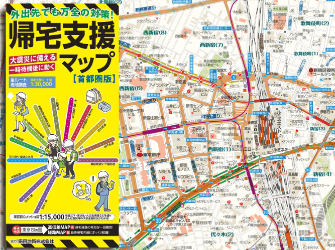 いつ発生しても不思議ではないといわれる首都直下型地震。オフィスやキャンパスで被災し、交通機関がストップした時、帰宅困難者は徒歩で自宅まで帰るか、安全な場所にとどまらざるを得ません。「帰宅支援マップデータ」は、帰宅困難者が徒歩帰宅を選択した場合に、自宅まで安全に帰れるようにサポートいたします。東京都選定の帰宅支援対象道路や隣接する県の緊急輸送路を中心に、独自に選定した帰宅支援ルートを収録しています。