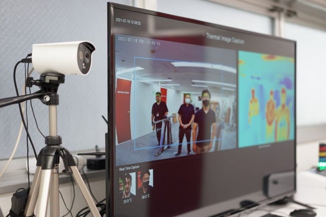 飛沫予防において最も重要なポイントは、マスクの着用の有無です。マップルのサーマルカメラは正確な体温検知はもちろん、マスクの着用有無までAIで自動判別しますので万全な水際対策が可能です。