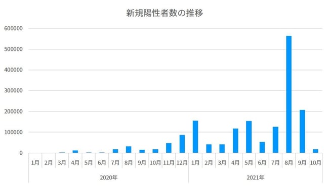 一方、今年の春以降は各自治体や企業において急速にワクチンの接種が進み、また、3回目の緊急事態宣言によって外出自粛基調が続いたことが奏功し、新型コロナウイルスの感染拡大に一定の歯止めが掛かり、ようやく落ち着きを取り戻して来ました。日本全国の新規陽性者数※2は、過去最高を記録した2021年8月には563,985人でしたが、直近2021年10月には17,223人となり、その数は大きく減少しています。特に東京都の新規陽性者数は過去最多を記録した8月13日の5,908人から、11月1日時点では9人と一桁にまで急速に低下し、収束への一定の道筋が見えて来ている状況です。※3