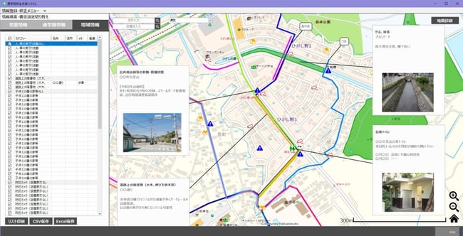 「通学路安全支援システム」は、生徒の自宅位置と通学路の一斉点検時や日々の危険箇所情報など様々な情報を地図上で可視化することができるソフトウェアです。