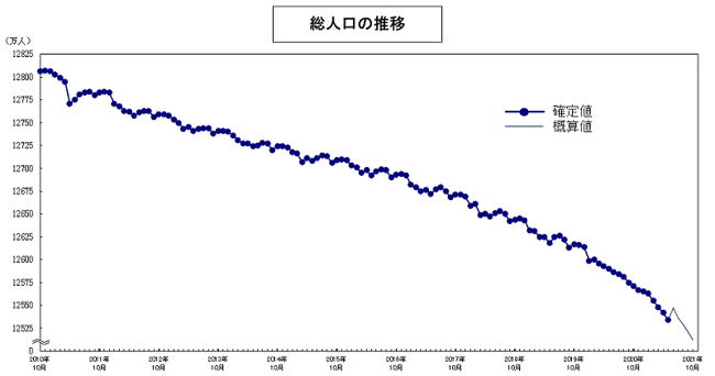 【令和3年10月1日現在(概算値)】<総人口>1億2512万人で,前年同月に比べ減少 ▲59万人(▲0.47%)グラフ出典:総務省統計局|人口推計(令和3年(2021年)5月平成27年国勢調査を基準とする推計値,令和3年(2021年)10月概算値) (2021年10月20日公表)https://www.stat.go.jp/data/jinsui/new.html より