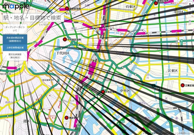 マップルラボ(https://mapple.com/labs)内のMAPPLEのベクトルタイルでは、当社のMVT形式の地図データベースと国土数値情報の洪水浸水想定区域(国管理河川)・土砂災害警戒区域データを重ねてご覧いただけるのである!