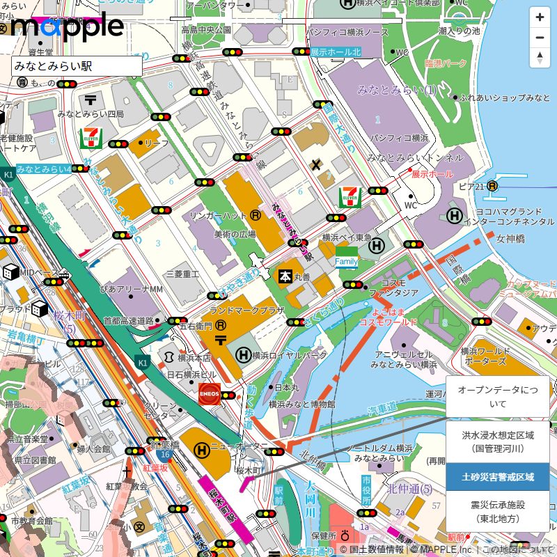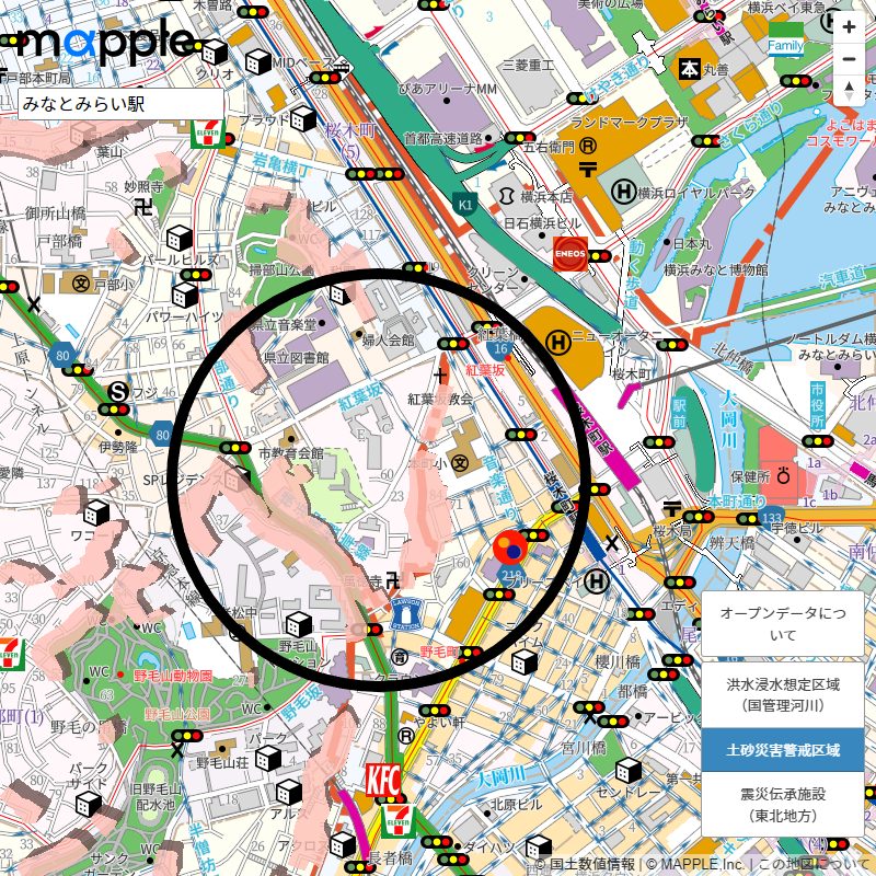 早速、みなとみらい駅で検索すると桜木町駅の方にちらっとピンク色の表示(土砂災害警戒区域)が。