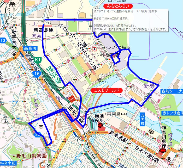 どうせなら楽しいコースを歩きたいものですが、歩きやすい格好するからハイソすぎる場所だと恥ずかしいかなとウダウダ考えた末に、走っている人がそこそこいて、個人的に安心感のある「横浜・みなとみらい」から始めることにします。