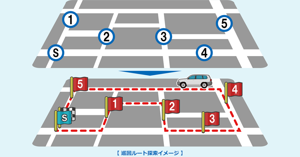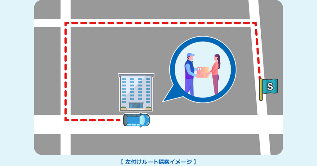 探索時に設定することで、経由地を含む目的地を左付けを優先に探索します。たとえば、物流等でセンターから各納品先を回るルートの場合、左付け機能を利用することで荷下ろしを考慮したルート探索ができ、スムーズに配送先を回ることができます。タクシー等の旅客輸送業でも有効な機能です。