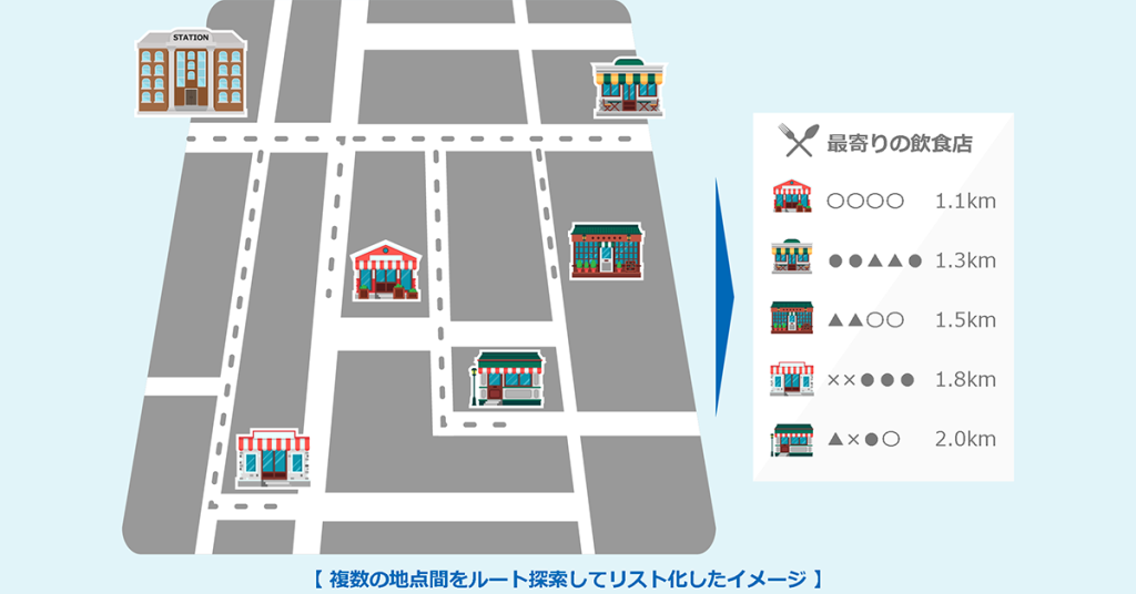 施設の地点情報があれば、ルート探索モジュールを使って近傍の施設を距離順に並べて、それぞれへの所要時間も付与してリスト化することもできます。※車ルートでの探索距離順となります。