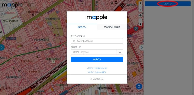 ② 画面右スライダーメニュー内の「ログイン」ボタンを押し、表示されるログイン画面で利用規約へご同意の上、アカウントの作成をお願いします。(次回以降は、ご登録いただいた情報でログインしてください。)