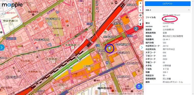 ③ ログイン後、任意のエリアを選択します。地図上の地番をクリックすると、右側に地番の情報が表示されます。エリア選択の際は、表示地図を縮小して移動すると便利です。