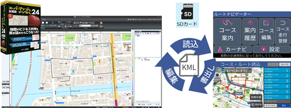 コピーした走行データをスーパーマップル・デジタルで編集、再度保存しルートナビゲーターに戻す事で、PC上で編集したコースを利用する事ができます。