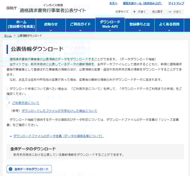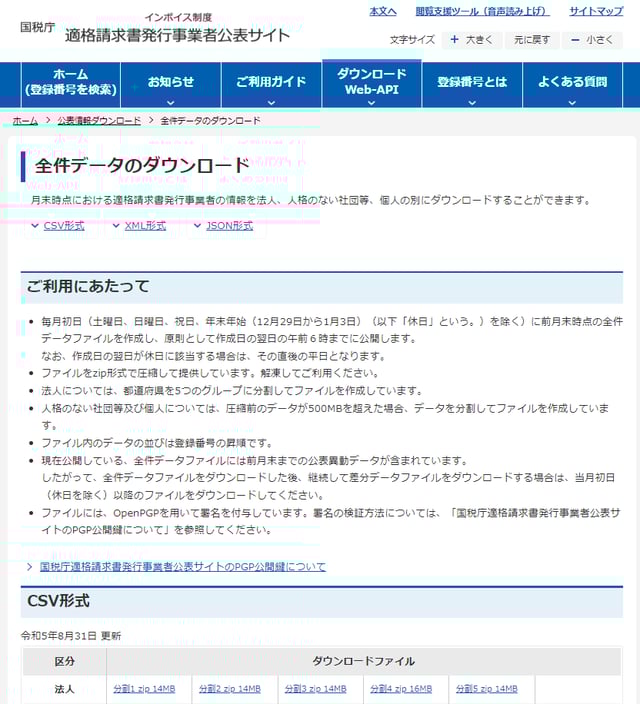 国税庁リストは上記サイトにてCSV/XML/JSON形式でダウンロードすることができます。