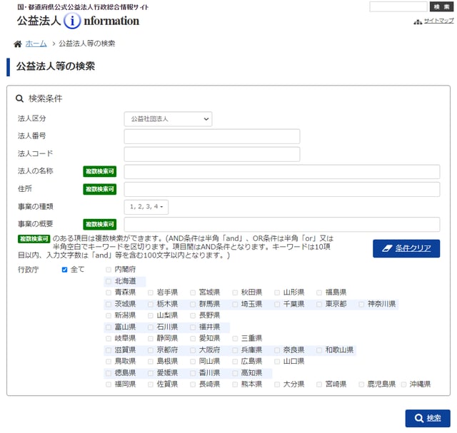上記サイトの「公益法人等の検索」から公益法人のリストをダウンロードします。