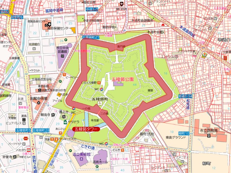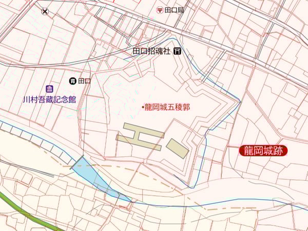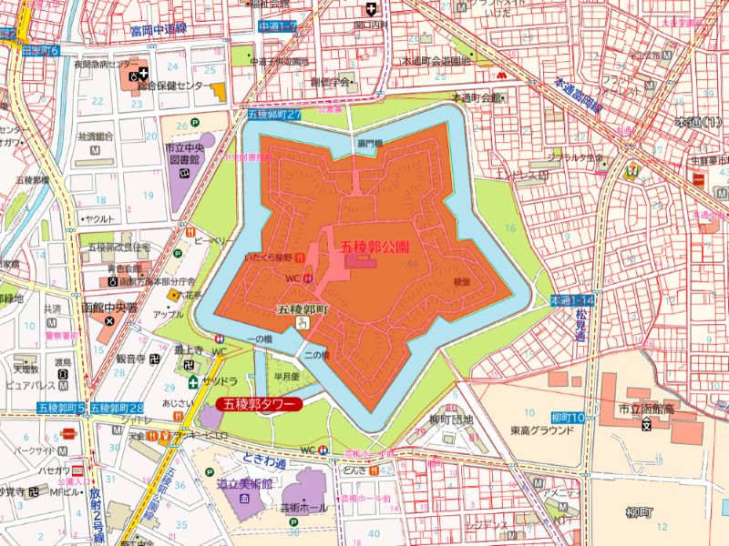 激動の歴史を持つ五稜郭ですが、地図で確認をしてみると本丸にあたる部分、土塁、城郭の形に合わせて筆(土地)が設定され、五稜郭の特徴である五稜星形の城郭が浮かび上がっています。このような特徴のある筆(土地)は長野県佐久市にあるもう一つの五稜郭である龍岡城跡でも分筆はされているものの五稜郭と同じように五稜星形を確認することができます。