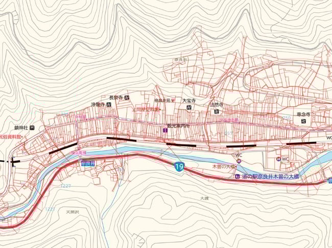 MAPPLE法務局地図ビューアで地図を見ると、宿場町は街道に沿う形でJR奈良井駅から鳥居峠に向かって宿場町を形成しています。宿場町のそれぞれの筆(土地)を見ると街道に沿って間口が狭く奥行きの深い特徴的な細長い形をしたものになっています。これは当時の税の制度が影響していると考えられます。