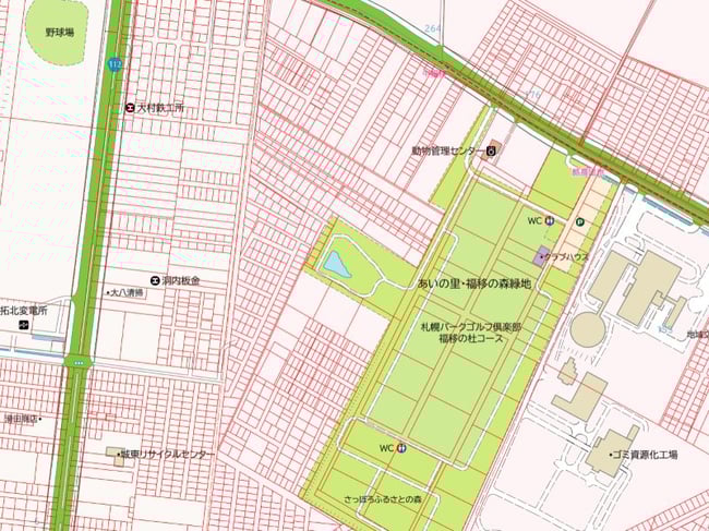 原野商法の痕跡は札幌市の篠路福移湿原周辺でも見られます。篠路福移湿原は札幌市の北部に位置し、近くには石狩川が流れ、江別市や当別町に隣接しています。地図を見ると篠路福移湿原周辺には規則正しく区切られた長方形の筆(土地)が並んでいることが分かります。一見すると住宅地のような形状ですが、空中写真で確認すると森や林、荒れ地などが広がっています。これらの筆(土地)は原野商法があった痕跡であると考えられ、登記簿上では数百人もの地権者がいるとされています。
