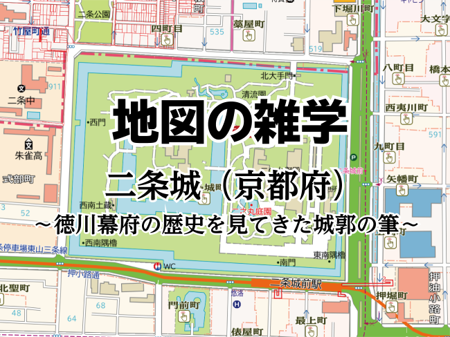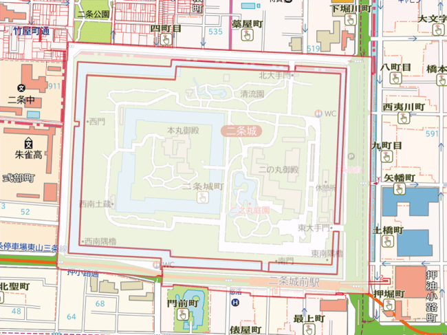 この筆(土地)は二条城の筆(土地)で、1603 年(慶長 8 年)に徳川家康によって築城されました。外周は約 2km、東西約 600m、南北約 400m に広がっています。二条城は徳川家康が天皇の居住した京都御所を守るため、また、上洛した際に宿泊するための施設として利用されました。