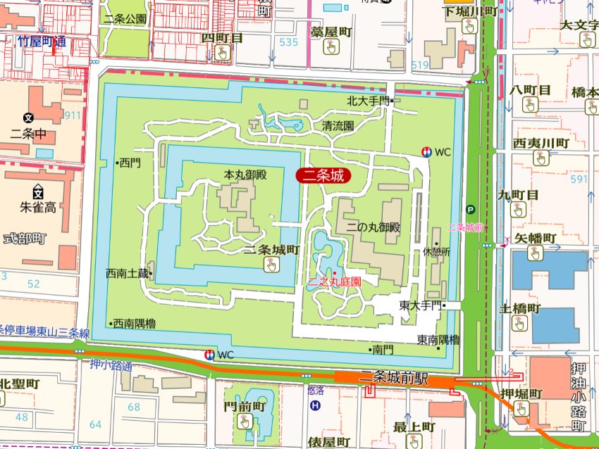 改めて二条城の筆(土地)を見ると、外堀に囲まれた城郭の姿がはっきりと表現されています。また、二条城には東西南北の四方に門があり、筆(土地)でもその形状が表れています。