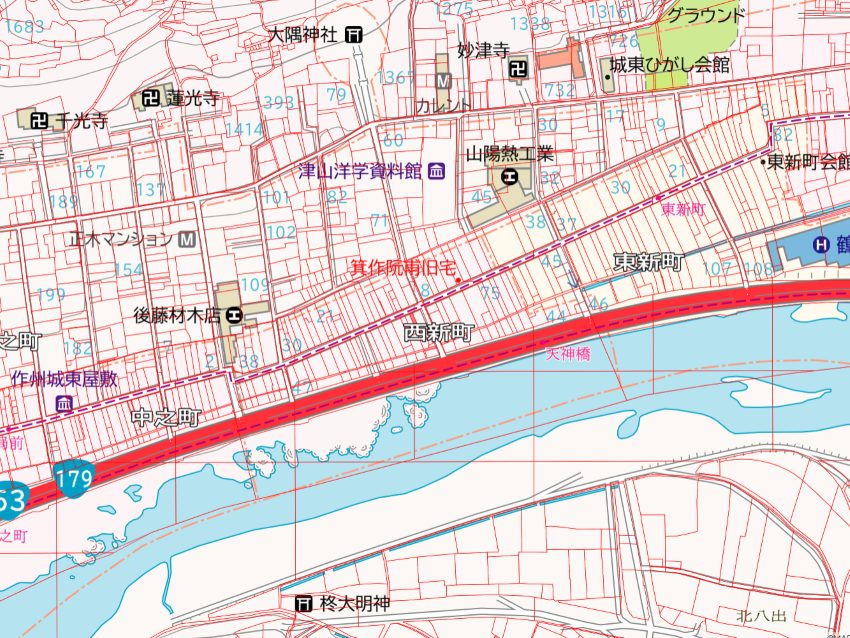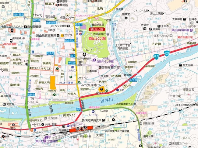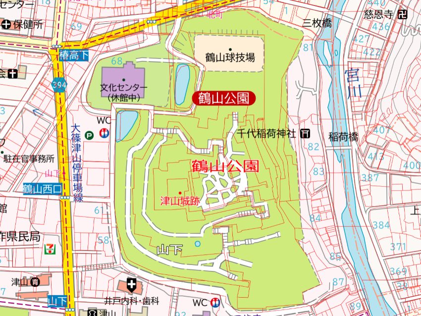 桜の名所として知られている津山城ですが、城と城下の筆(土地)には城郭や商家町、寺町、街道など当時の地割りが色濃く残されており、城下町の特徴が良く表されています。