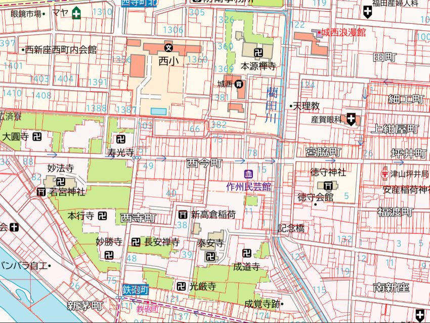 また、城下町の筆(土地)を見ると、商家町が続いていたとされる街道に沿って、間口が狭く奥行きの深い細長い形をした商家町の姿を見ることができます。さらに、街道沿いにある比較的大きな筆(土地)を持つ寺院から、寺町の姿を見ることができます。