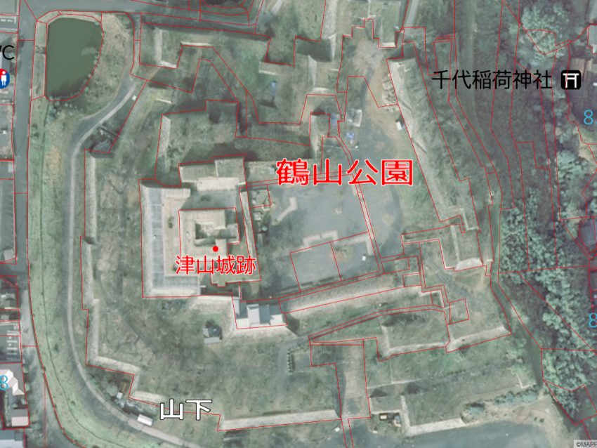 津山城の筆(土地)を見ると城を形成する城郭の姿が綺麗に筆(土地)として表されています。城の中央にある天守を始め、多門櫓や備中櫓など櫓の筆(土地)、本丸、二の丸、三の丸の筆(土地)、櫓が建っていた石垣や天守へ繋がる道の筆(土地)など見ることができます。