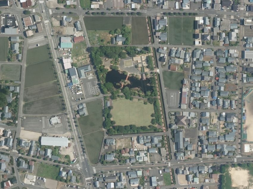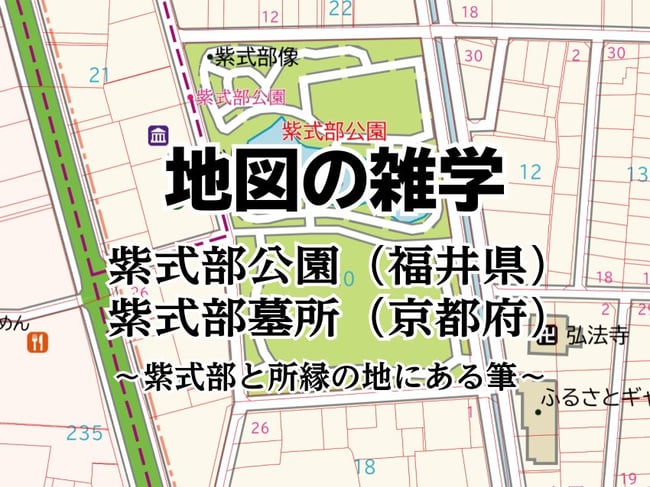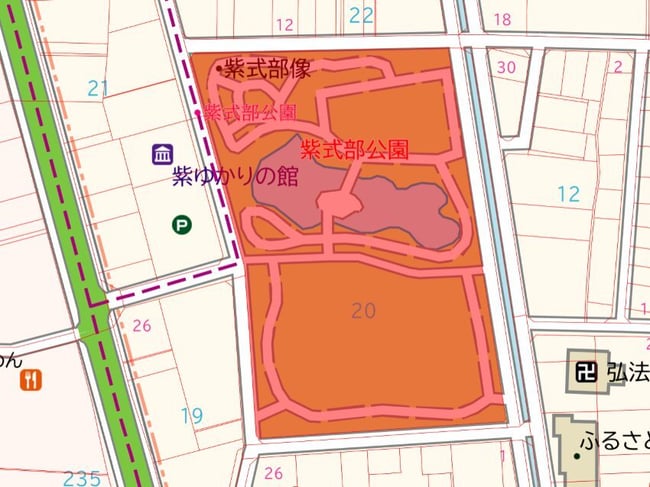 紫式部公園を地図でみると筆(土地)が一筆で設定されています。1974 年~1978 年の空中写真では田畑になっているようですが、2021 年の空中写真では周辺の道路や公園が整備されています。紫式部公園は 1981 年(昭和 56 年)の都市計画決定によって整備された歴史を感じることができる都市公園で、区画整理事業で一筆になったと考えられます。