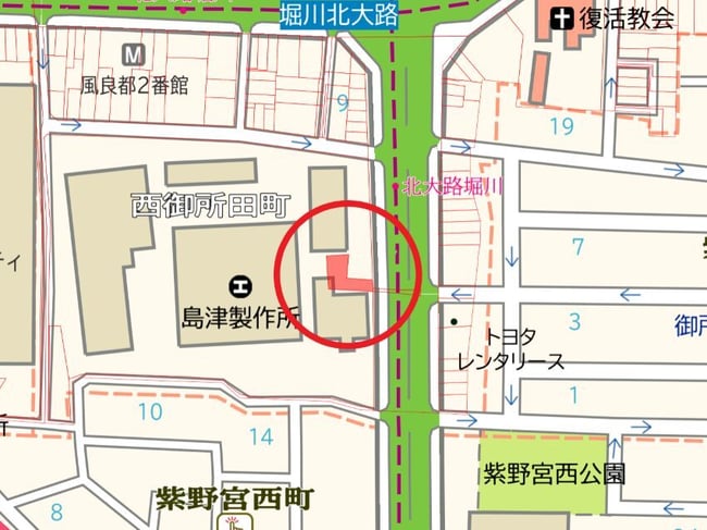 さらに紫野は紫式部が余生を送った場所であったという逸話もあり、紫式部と大変ゆかりの深い土地だったようです。地図で筆(土地)を見ると、墓所の筆(土地)(図中の赤丸)は工場区画の一画にありながら、工場とは別の筆(土地)として一筆で設定されており、人々によって墓所が大切に守られていることが伝わってきます。
