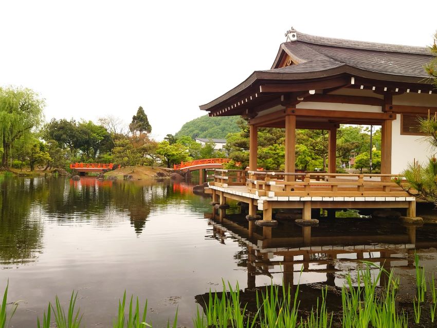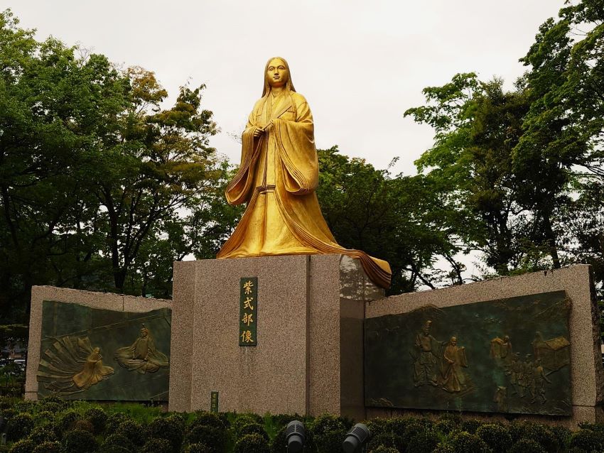 福井県越前市は、紫式部が京を離れて一年余りを過ごした場所です。越前国司として、この地に赴任した父の為時とともに訪れました。越前市には紫式部に所縁のある地として、紫式部公園が整備されています。公園内には平安朝式庭園が造られ、金色の紫式部像や寝殿造りの釣殿、池泉があり、平安貴族が見たであろう風景を見ることができます。また、「紫ゆかりの館」が隣接しており、紫式部に関する資料を見ることができます。