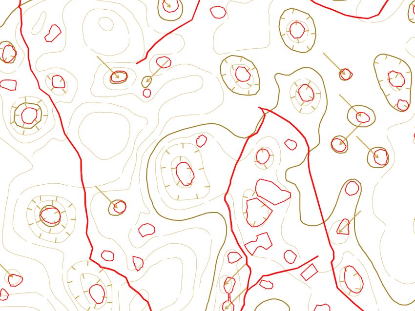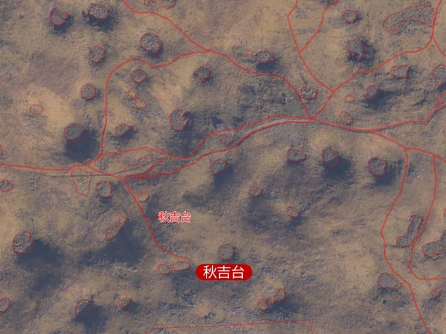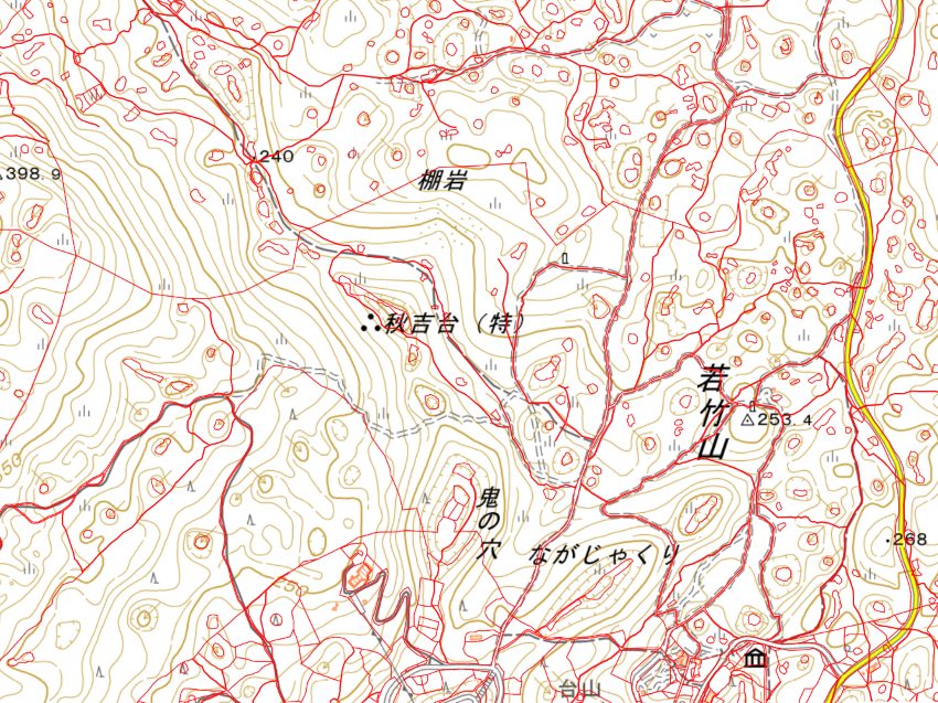 秋吉台ではカルスト台地ならではの筆(土地)を見ることができます。地図で秋吉台周辺を見ると、歪んだ円など、楕円形の筆(土地)が点在していることが分かります。地形図と合わせてみると、筆(土地)は外周が盛り上がり、真ん中が窪んでいる地形と合致しています。この窪地はドリーネと呼ばれる地形で、筆(土地)はこのドリーネの形に合わせて設定されています。