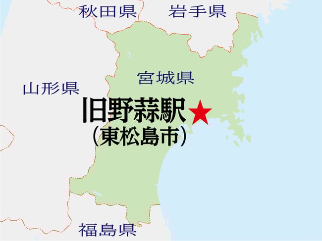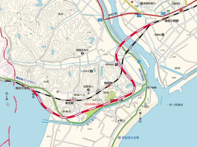 地図で嵯峨渓を見ながら北へ目を向けると、JR仙石線が走っているのが分かります。JR仙石線は仙台市と石巻市を結ぶ路線です。JR仙石線のルートをよく見ると、仙台方面から石巻へ向かう途中、東名駅手前で海側へ向かい野蒜駅の先で、再びJR仙石線に合流する細長い筆(土地)があります。