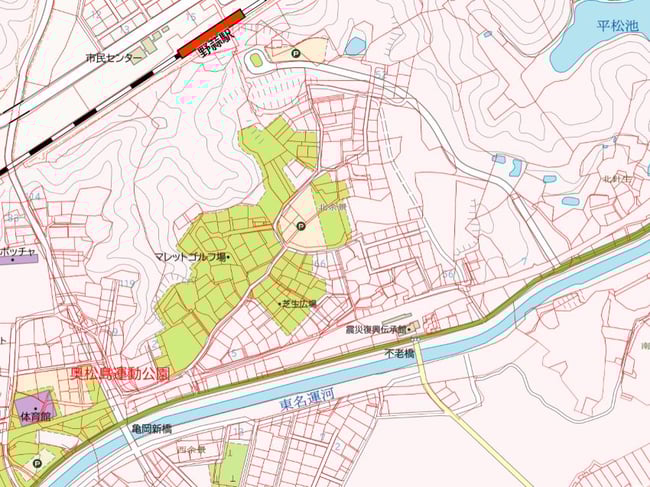 この細長い筆(土地)は JR仙石線が通っていた跡です。以前は、JR仙石線は現在より海側(赤いルート)を走っていました。しかし、2011年の起きた東日本大震災によって JR仙石線は被災、途中にあった旧東名駅と旧野蒜駅も津波により甚大な被害を受けました。その後、JR仙石線は内陸部を通るルートが検討され移設されることになりました。被災した東名駅と野蒜駅も高台へ移設されることになり、2015年にJR仙石線は復旧しました。現在、旧野蒜駅があった場所には震災の記憶と教訓を後世に伝える震災復興伝承館が開設されています。