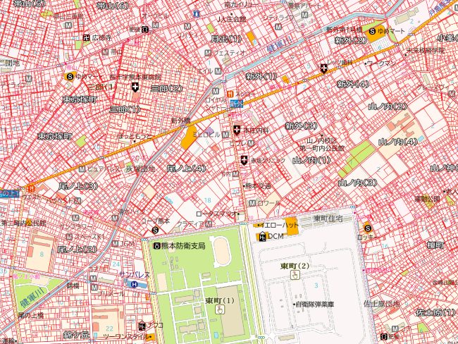熊本空港があった場所の筆(土地)を見ると、筆(土地)の形状から滑走路があったことが想像できます。そして、空港があった場所より南には、周りの筆(土地)とは明らかに異なった並び方をしている筆(土地)と、さらにその先には広大な面積を持つ筆(土地)があることが分かります。
