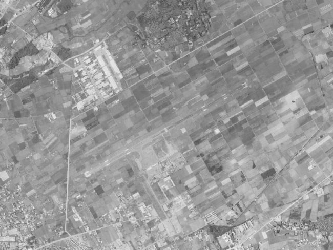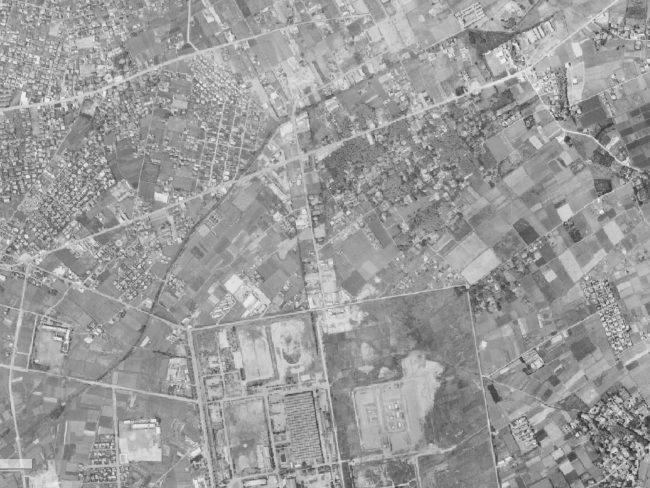 これらの筆(土地)は熊本空港の前身であった旧陸軍の飛行場と密接な関係がありました。太平洋戦争の際に、旧陸軍の飛行場の近くには飛行機を製造する工場があったとされています。また、飛行場と工場の間にはそれぞれを結ぶ誘導路が延びていたと伝わっています。そこで、筆(土地)を見ると、飛行場と工場、そして誘導路の場所が合致しているように見えます。