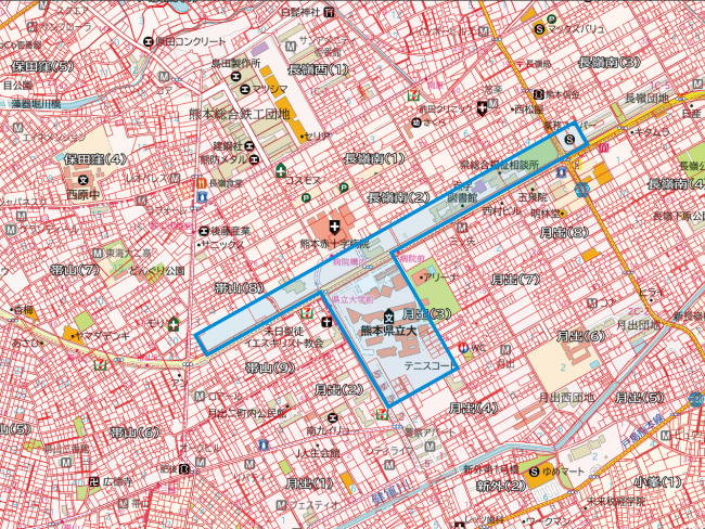 JR熊本駅や熊本城がある中心街の東に位置する月出・長嶺地区の公共施設が集まっている区域には、一筆が広く設定された筆(土地)が並んでいます。俯瞰して見ると他の筆(土地)とは明らかに異なる並び方をしていますが、実はここには熊本空港がありました。熊本空港は1960年(昭和35年)に旧陸軍飛行場を利用して開港しました。その後、滑走路が短かったことにより飛行機の発着に限界が生じたことから1971年(昭和46年)に現在の場所へ移転しました。