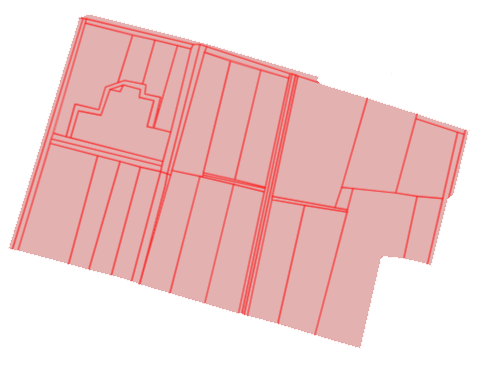 高知県南国市前浜地区にある掩体壕の凸の筆(土地)は、長方形の農地の筆(土地)の中に浮いているよう設定されています。掩体壕のある部分を空中写真で拡大すると、農地の中に大小3つの凸型をした建造物が見られます。この建造物が掩体壕です。前浜にはこのような掩体壕が複数残されており、地域名から「前浜掩体群」と呼ばれています。