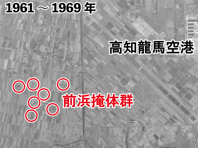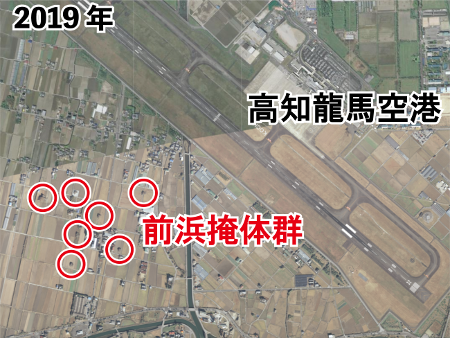 前浜掩体群の近くには、日本海軍の飛行場があったそうで、太平洋戦争が行われていた1944年(昭和19年)に高知龍馬空港の前身である旧海軍航空基地が建設されています。このことから、前浜掩体群は空襲に備えて、飛行場から比較的近い場所に造られた施設といえます。終戦後、米軍に接収されていた空港は、1952年(昭和27年)に返還され、民間飛行場とし て再開されました。