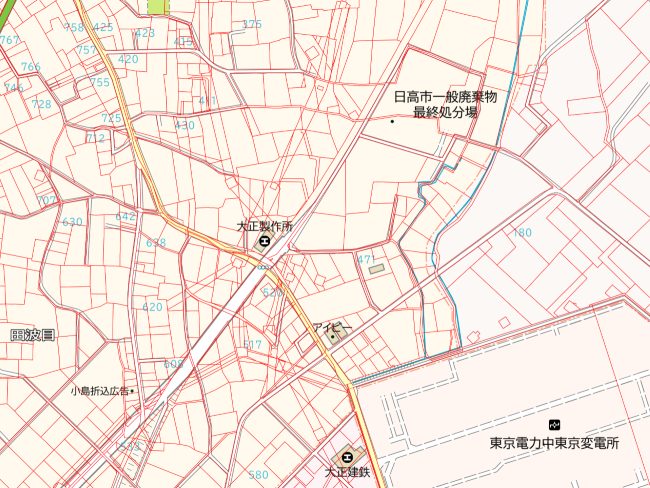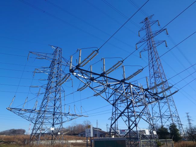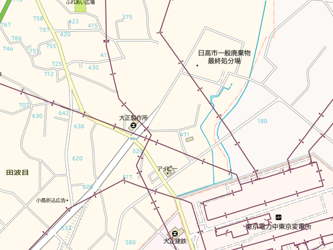 全国で見られる送電線の筆(土地)ですが、その中でも少し変わった送電線の筆(土地)を見ることができるのが埼玉県日高市にある中東京変電所の周辺です。中東京変電所の周辺を地図で見ると、送電線が各方面へ走っており、送電線が二重三重に交差しています。これは変電所から各地域へ電力を供給しているためです。筆(土地)も同様に送電線の筆(土地)が交差しています。送電鉄塔といえば、高い鉄塔をイメージしますが、この地域では空を見上げれば「すぐそこには送電線」というように低い鉄塔と送電線を見ることができます。
