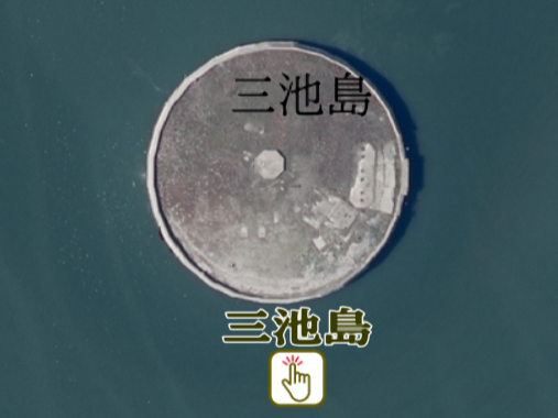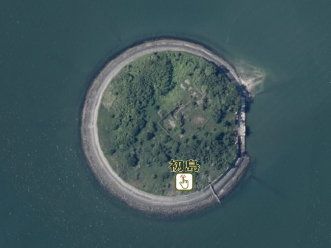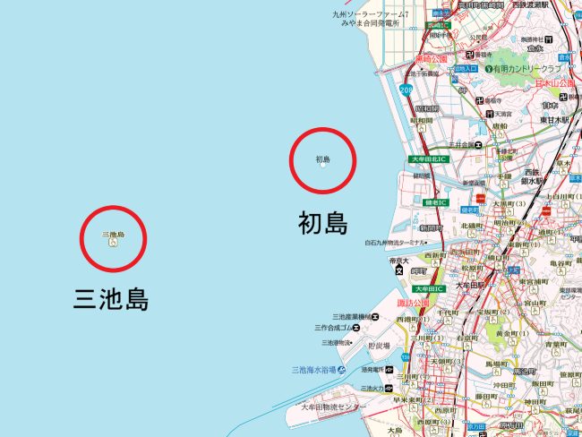 地図を見ると大牟田市の沖合の有明海に三池島と初島という2つの小さな島を見つけることができます。地図を拡大すると三池島は円形の筆(土地)、初島は円形の一部が欠けた筆(土地)になっています。筆(土地)の形状は島の形状と合致しているので、島の形がそのまま筆(土地)として設定されているようです。