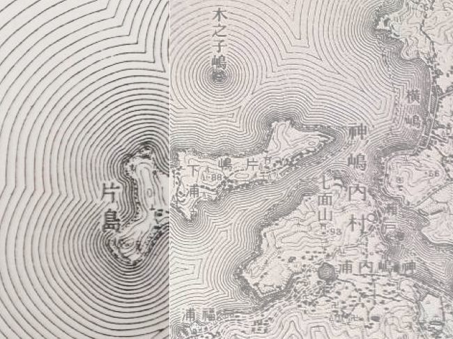 干拓前の姿は古い地図や1970年代の空中写真で確認することができます。神島は当時すでに陸続きになっていますが、片島と木之子島は笠岡湾の島として表されています。どちらの島も干拓後に陸続きとなり、耕作地の中に残された小高い丘のような土地になりました。今では海に浮かんでいた当時の姿を見ることはできませんが、筆(土地)には干拓前の笠岡湾の姿が残されています。