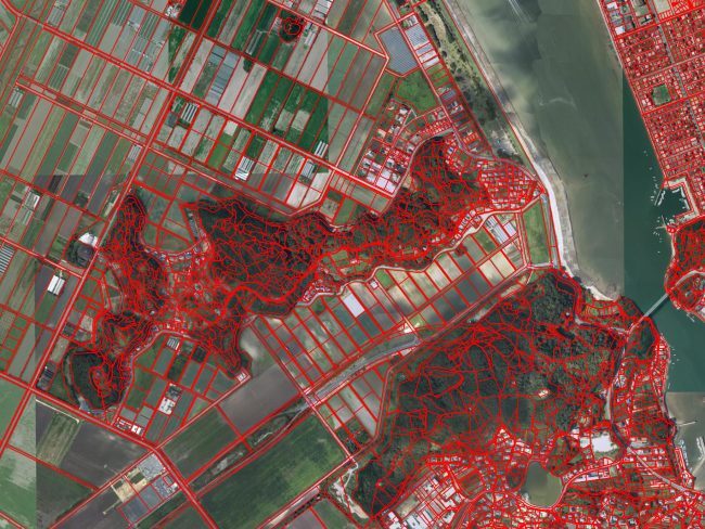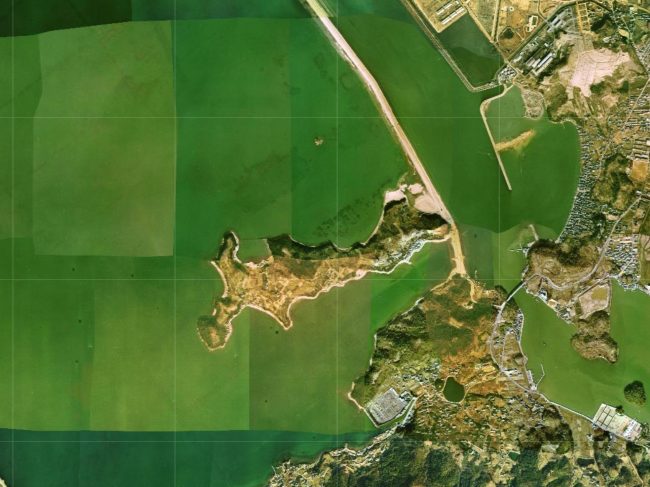 干拓事業の形跡は筆(土地)にもよく表されています。笠岡湾を地図で見ると、規則正しく並んだ細長い筆(土地)の中に、不定形な筆(土地)が、まるで海に浮かんでいるように表されています。空中写真と重ねて見ると不定形の筆(土地)には木々が茂っているようです。この筆(土地)こそが笠岡湾内にあった島々の跡です。陸続きとなった現在の風景からは小高い丘のように見えますが、干拓される前は神島、片島、木之子島という島がありました。