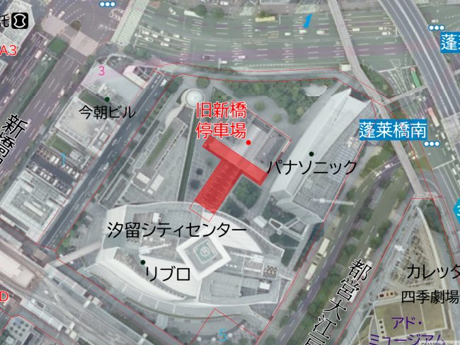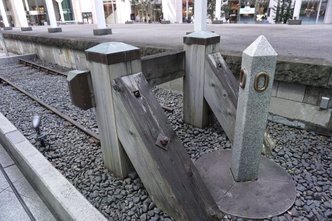汐留駅の跡地は1990年代に再開発されることになり、発掘調査が行われた結果、新橋停車場の遺構が見つかりました。関東大震災によって焼失する前の建物の写真などが残っていたこともあり、遺構の上に当時の姿を可能な限り復元するプロジェクトによって、2003年(平成15年)に旧新橋停車場が誕生しました。新橋停車場は復元によって、当時の姿が蘇り、筆(土地)にはプラットフォームと駅舎の姿が表されています。